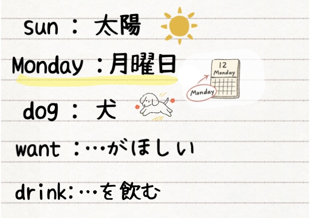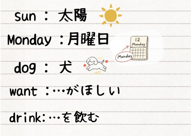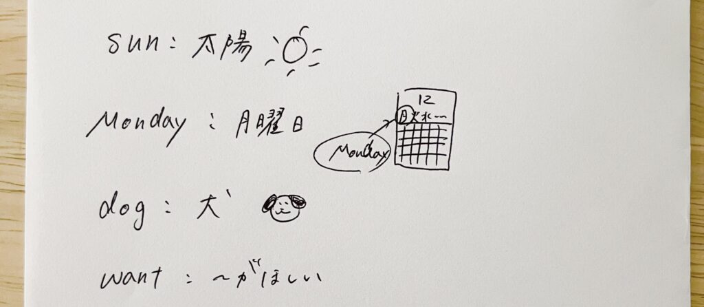 単語用ノートに英単語と日本語の意味を書きます。そのときに英単語の横にイラストを描きます。(描けそうなものだけでOK)