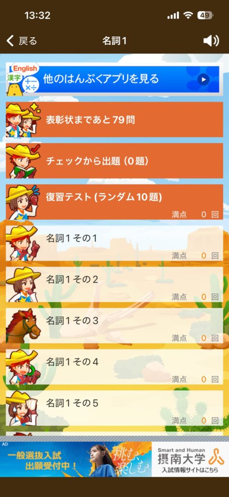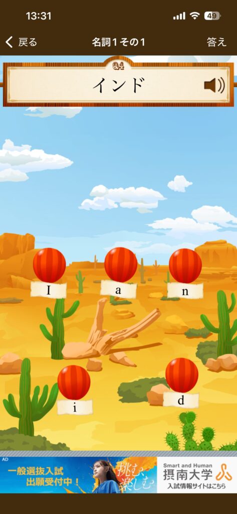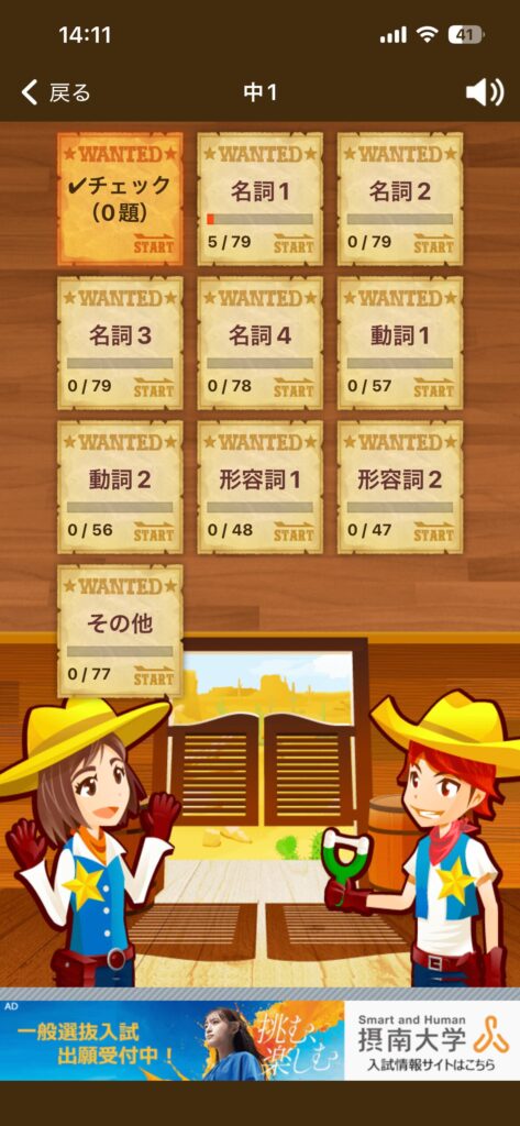 ゲーム感覚で楽しく学ぶことができるのが特徴です!また広告のおかげですべての機能を無料で使えます。中学校用のモードでは1800単語と中学生に必要な単語数をしっかりカバーしています!